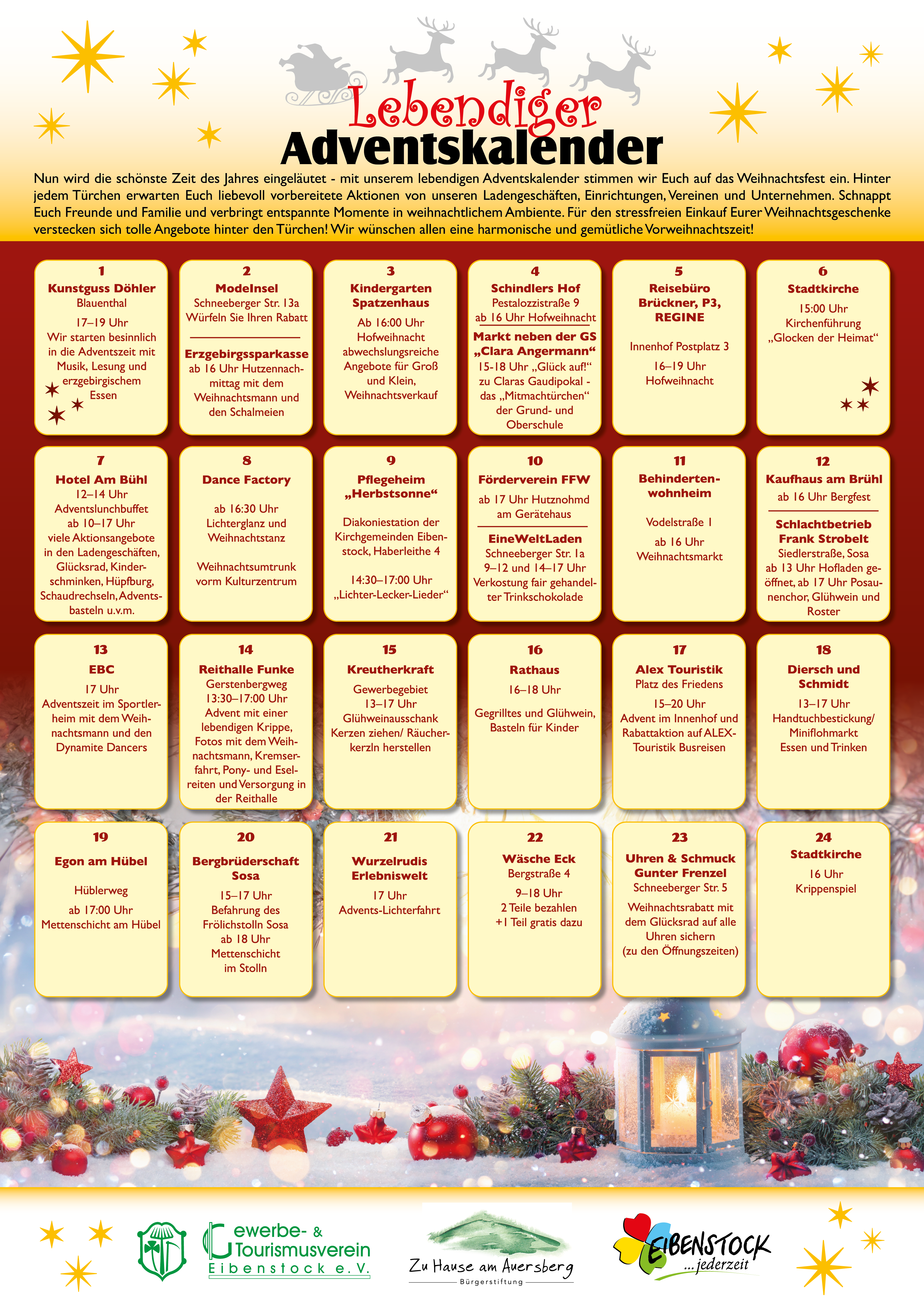Ein "Lebendiger Adventskalender" ist eine wunderbare Tradition, die Vorfreude und festliche Stimmung in der Adventszeit verbindet. Bis Heilig Abend wird in Eibenstock täglich 1 belebtes Türchen geöffnet. Es gibt immer etwas anderes zu entdecken – so z.B. Verkostungen, Schauschnitzen, Hutzenabende mit Musik, Einkaufsaktionen und vieles mehr. Wir öffnen das 7. Türchen zum 2. Advent am 07.12.2025.