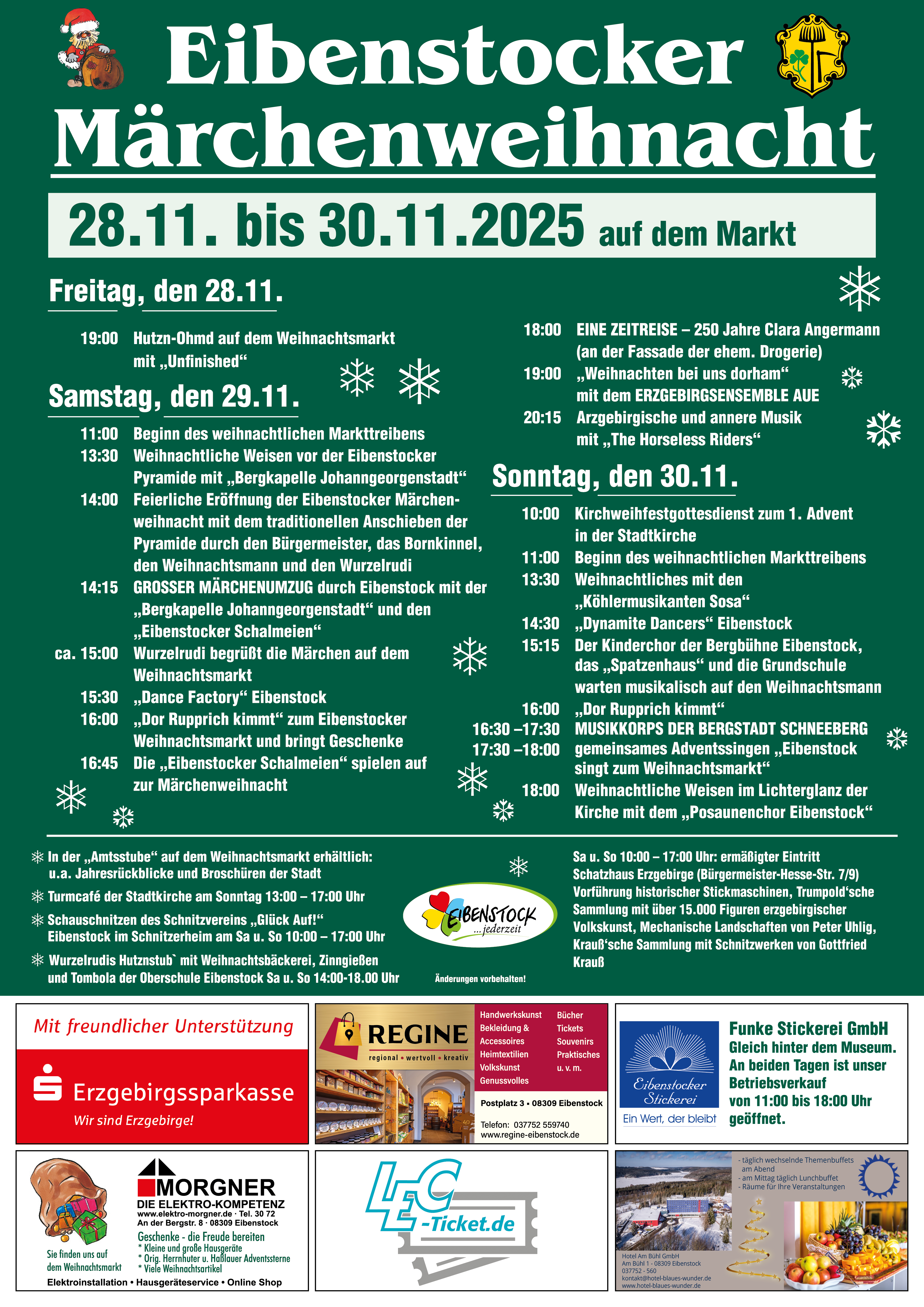 Tauche ein in eine glitzernde Welt aus Lichterglanz, traditionellem Handwerk und dem verführerischen Duft von Glühwein und gebrannten Mandeln. Zwischen liebevoll geschmückten Ständen gibt es handgefertigte Erzgebirgskunst zu entdecken, kulinarische Köstlichkeiten zu genießen und die herzliche, stimmungsvolle Atmosphäre zu spüren, die nur im Erzgebirge zu finden ist.